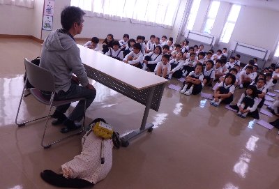 今、4年生は「私たちの身の回りの生活と福祉」について総合的な学習の時間に勉強を進めています。その学習の中で先週、盲導犬と生活を共にする方に学校へ来ていただきふだんの生活についてお話をうかがいました。盲導犬の名前は「クルーズ号」です。主人を助けるとってもかしこい犬でした。子どもたちはその行儀の良さに感心していました。