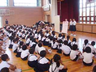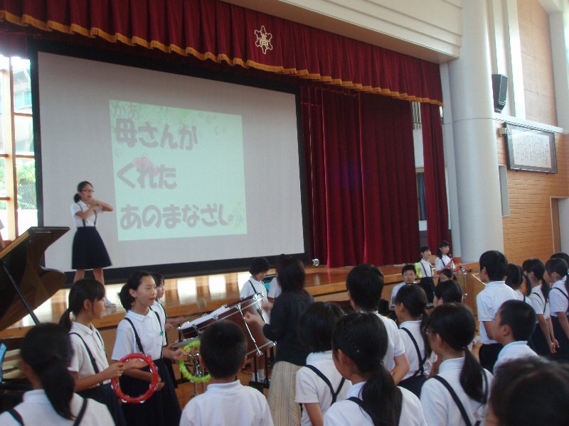 全校集会では音楽ボランティアが伴奏してくれます。指揮者ものりのりです。