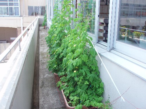 4年生では、ベランダにゴーヤの苗を植えてエコカーテンにしています。