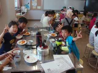 今日は希望者が調理室に集まり「キッズクッキング教室」が開かれました。学校栄養士、市役所の健康推進課の職員の方々、地域の食生活改善委員みなさんが珍しい料理の作り方を教えて下さいました。
