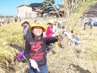 刈り取りはみんな初めての経験で稲の持ち方や鎌の使い方など親切に教えていただきました。刈り取った稲わらはコンバインで脱穀しました。おかげでたくさんのもみを収穫することができました。