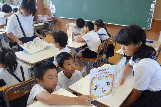 今日の長休みは、全校一斉のお話会をしました。いつもは先生が本を読んでくれます。今日は高学年のお兄さんお姉さんが低学年に、二人で組になって読み聞かせをしました。