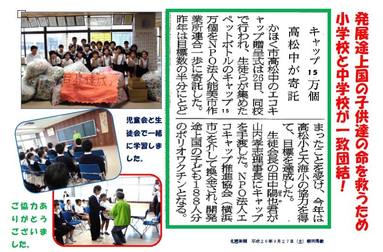 集めたエコキャップを中学校に届けました。これからも続けます。高松地区小中3校の協力の結果です。