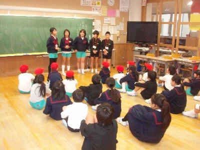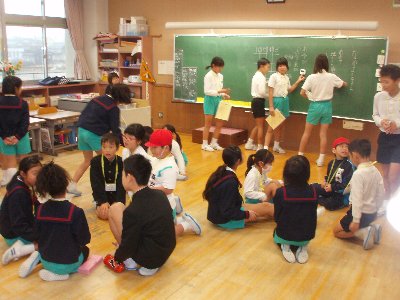 そこで今日は休み時間になかよしグループが集まって、班のみんながもっと仲良くなれるように遊びをしました。した遊びは「古今東西」というゲームです。班ごとに「お題」にあわせて1分間でどれだけ言えるか数えて楽しみました。リーダーは5年生でした。6年生はアドバイスをしました。こうやって良い伝統が後輩に受け継がれていきます。