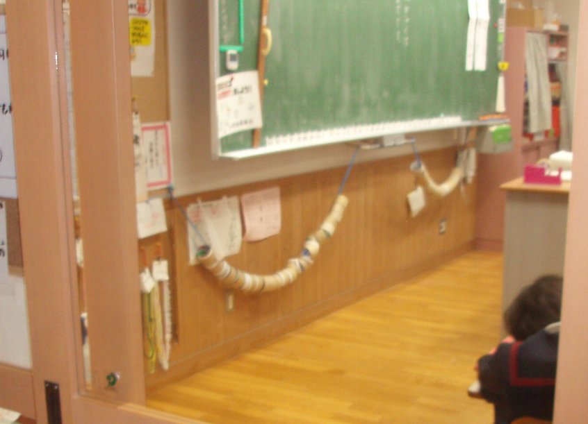 もうひとつ右の写真は・・・、変な物が3台?おかれました。さて、何に使う物でしょう。ヒント「冬の体力づくり」に使います。答えは次回使っている写真をお楽しみに・・・それより、ぜひ子どもさんに聞いてみて下さい。