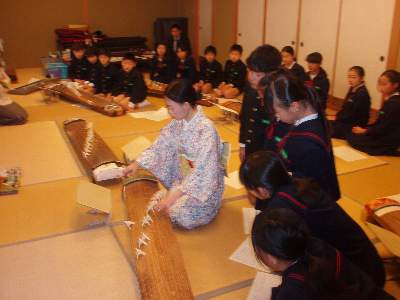5年生と6年生が参加しました。13本の弦から発せられる古風な音色、一足先にお正月がやったような感じがしました。授業の終いには「さくら」を奏でる子もあらわれてびっくり。ところで高小にこんな素敵な和室があると知っていましたか。