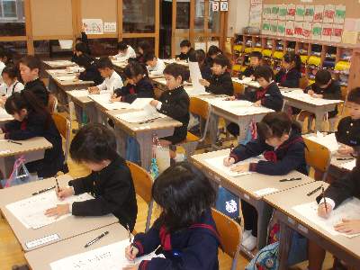 2限目と3限目は、全校で書き初め大会でした。1.2年は鉛筆、3年以上は筆で。ていねいに元気良く書くことができました。冬休み、家で練習したのをご覧になりましたか。学年によって書く字もちがいます。うまく書けたかお子さんに聞いてみて下さい。金曜と月曜は公開しています。お越し下さい。