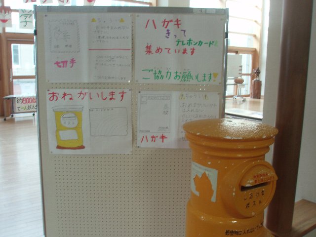 今度は、実際に自分たちが役立つ活動に取り組んでいます。「はがき」「きって」テレフォンカードを集めています。これらをまとめて、福祉活動に役立てるそうです。お年玉年賀はがきの抽選も終わり、家に書き損じはがきはないでしょうか。玄関ホールに黄色いポストがあります。どうぞその中に。よろしくお願いします。