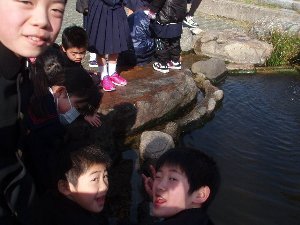 先週は、雪が積もってびっくり、今週は一転春らしい陽気になっています。先週に比べて温度が10度以上暖かいようです。そんな中、学校正面の池の周りに4年生たちが何かをさがしています。