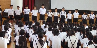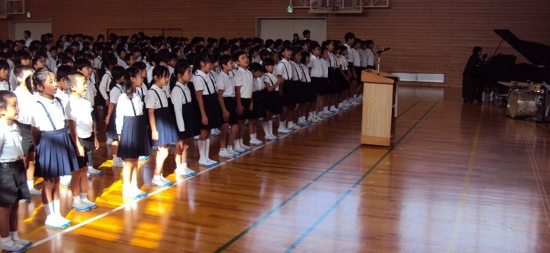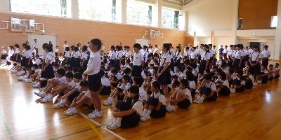 今日は、一日早かったですが、月初めの全校集会を1限目に行いました。今日も元気に校歌を歌う子どもたちの写真です。夏休み科学研究作品コンクールの賞状が届いたので伝達しました。6年生の越村さんが「糀の研究」で代表として賞状を受け取りました。校長先生の話は「いじめ」についてでした。そのあと太田先生から生活目標「姿勢を正しくしよう」の話を聞きました。いつものように背筋を伸ばして顔を上げた素晴らしい姿勢で話を聞くことができました。「今月のキラキラさん」もたくさん紹介されました。