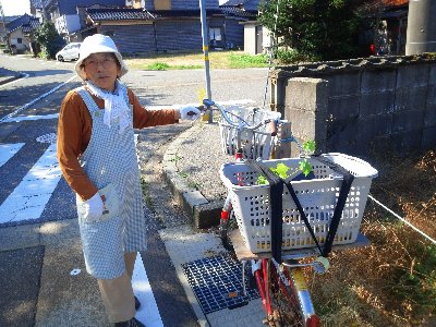 この方は毎朝プール横の横断歩道で黄色い旗を持って立っていて下さる竹中さんです。7月はのプール横には、4年生の畑があり、たくさんの苗が植えてありました。「先生、ヘチマをよかったら分けてくれんかね、畑で育ててみたいし。」とおっしゃりお渡ししました。学校のヘチマは今年の猛暑にやられ、ほとんどが実をつけませんでした。竹中さんの畑のヘチマはこんなに大きな実をたくさんつけました。その中から学校の子どもたちのために2本持ってきて下さいました。理科室の前にかざらせてもらいました。2枚目は、苗を自転車のかごに入れて持ち帰るときの写真です。いつも子どもたちのためにありがとうございます。