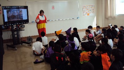 英語活動では、いろいろなことを学習します。言葉だけでなく外国の文化も・・・ 5年生が教室でなにやらカードを使って・・・体育館ミーティングルームに集まり、仮装をして、ごぞんじ「ハロウィーン」、ブリーナ先生は何のかっこうかな??