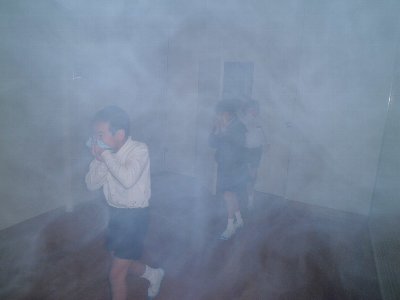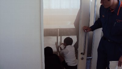 訓練の実際ですが、いつも避難経路に使っている教室外のベランダが地震で倒壊、通れなくなったという設定です。校舎内二方向の階段と体育館玄関を使って速やかに避難することができました。途中、防火壁やシャッターが行く手をふさいでいる場所もありましたが、落ち着いて扉をくぐり、いつもと変わらぬ時間で運動場に避難を完了することができました。要した時間は点呼を含めて4分15秒、きびきびと行動できました。分署長さんに講評をいただいた後、体育館に移動し、金沢大学で防災の研究をなさっている青木先生から地震についてわかりやすくお話をしていただきました。高松でも、震度6の地震がいつ起きてもおかしくない、日頃から家庭でも準備をしておくことが大切だと子どもたちに教えて下さいました。そのあと5年生は煙道体験、6年生は消火器の扱い方体験をしました。