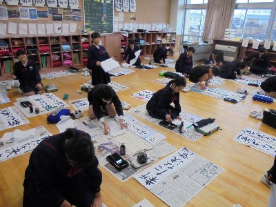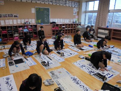 正月行事である「書き初め大会」をしています。昔から正月2日に書き初めをすると字の上達だけでなく、その年1年の学業も成果があると言われています。2日にはお家で書き初めをしたでしょうか。