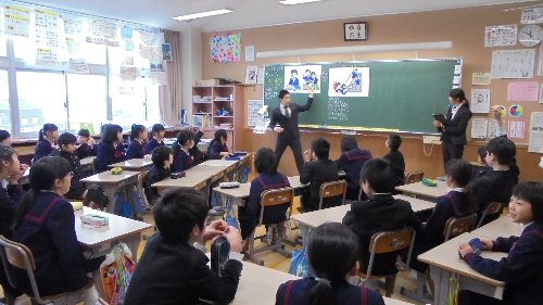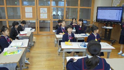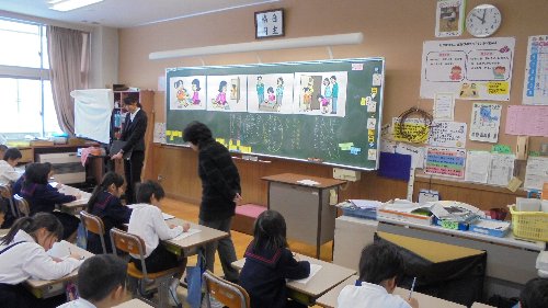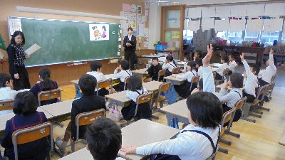 火曜日と水曜の午後、高小では英語の勉強が時間割に入っています。今日は3限目に5年2組で英語を学習していました。先生が教室に二人、担任とアメリカ人のブリーナ先生です。英語は近い将来「教科」になって教科書で学習し、成績もつくことになります。今は、まだ「英語活動」です。