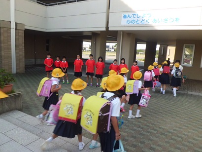 玄関での挨拶運動が始まりました。各クラス順番に玄関に立ち、大きな声で挨拶しています。9月1日には、にゃんたろうもきてくれました。