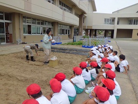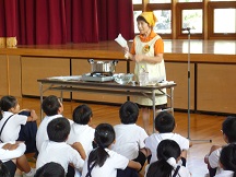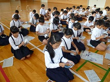 9月30日(金)、5年生は、石川県栄養士会の橋本先生、大塚製薬さん、6人の保護者の皆さんのご協力により、震災食についての体験学習を行いました。いざという時に役立つご飯やおかずのエコクッキングや新聞紙でのお皿やスリッパの作り方などを教えていただきました。