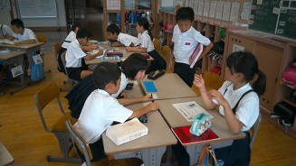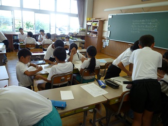 高松小学校では、学習機器として9月から導入されたタブレット20台を活用して授業を行っています。まだまだ操作に慣れる学習ですが、どの学年も楽しそうに活用しています。
