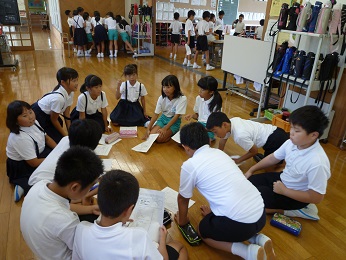 四年生は、図書館司書の向さんに、国語の学習として「百科事典を上手に活用する」方法を教えてもらいました。班で協力しながらいろいろなことを調べてみました。