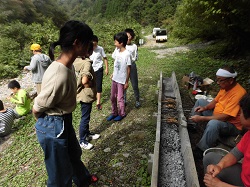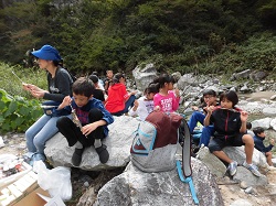 合宿2日目です。朝食の後の午前の活動は、「イワナつかみ」です。自然が残る川に移動し、岩場に潜むイワナを手で捕まえて、食します。人間は、動植物の命をいただいて生きていることを体験し、恵みに感謝するという活動です。