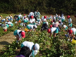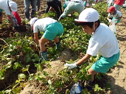 説明を聞いて早速いものつるをみんなで引っ張りました。たくさんの「かほっくり」が土の中から出てきて、子どもたちは大喜びでした。それぞれ抱えきれないほどたくさんのいもを持って帰りました。