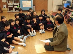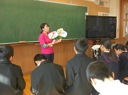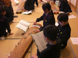「春の海」など見事な演奏を披露していただいた後、箏曲でおなじみの「さくら」に挑戦です。体の位置や手の構え、爪のはじき方を教わりながらやってみました。児童は、響く箏の音ににっこりしていました。