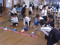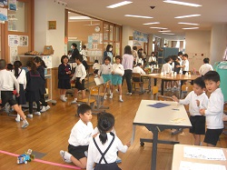 2年生は、生活科の学習で身近な材料を使って「おもちゃランド」に取り組んできました。今日はその成果を発表する機会として、1年生を招いて「ようこそおもちゃランド」を開催しました。2階の2年教室フロアを全部使って、それぞれがたくさんのお店を開き、1年生にゲーム形式で、カーレースや輪投げ、的当てや釣りなど様々な活動を楽しんでもらいました。