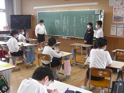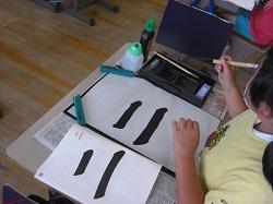 筆の持ち方や、墨の付け方、筆の運びなど、丁寧に教えていただきました。3年生は、よい姿勢で、慎重に「二」の文字を書きました。手に墨が付いたりしてたいへんでしたが、新しい学習に挑戦することができ満足そうでした。