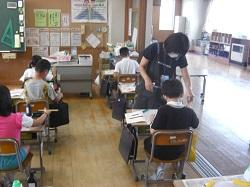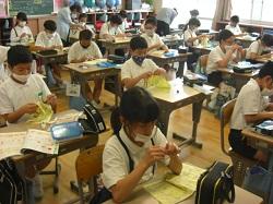 5年生は、家庭科で裁縫に取り組んでいます。この技術があれば、将来ちょっとした場面でとても役に立ちますから、生きる力になります。また、手先を器用にするいい運動にもなります。今日は、地域の山口さん、東谷さんが、応援にきてくれました。玉結びや玉留め、波縫いなど布を使って進めていきました。なかなかうまくいかずにため息も聞かれましたが、あきらめずみんな集中しながら、がん張っていました。ボランティアの皆様ありがとうございました。