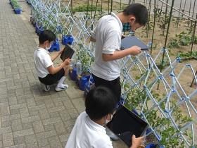 野菜、花、稲など本校で育てられている植物も気候に合わせるようにどんどん大きく成長しています。野菜は早くも花から実を付けはじめ、アサガオも大きく葉を広げています。稲は、バケツの高さを超えるようになりました。