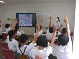 5年生が、食料の生産地(都道府県・海外)を調べ、タブレット上の日本地図に入力していました。スーパーマーケットのチラシから生産地を調べ、地図上にわかりやすくまとめる活動でした。班ごとに協力して情報を集約して作成しています。