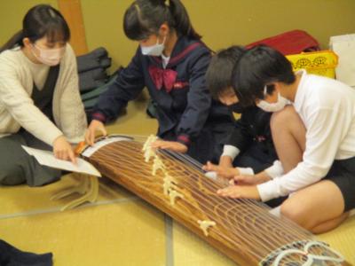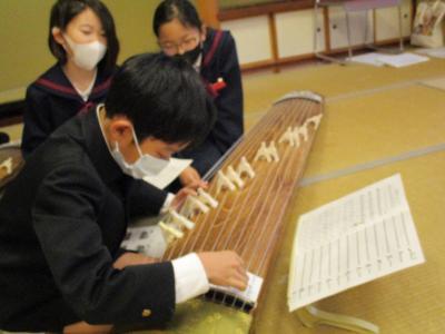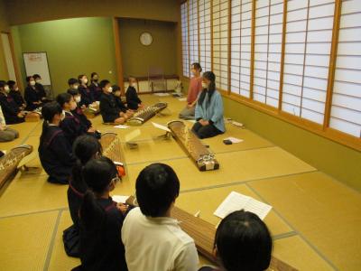 4・5年生が音楽の時間にお琴の演奏を体験しました。講師は川守雅楽伎先生です。演奏の前に兼六園の徽軫灯籠(ことじとうろう)の由来は琴からきているといったお話や、海外での演奏経験談など、子どもたちは興味深く聞いていました。その後、「春の海」などの演奏を聴かせていただきました。演奏体験ではグループに分かれて「さくらさくら」を弾きました。象牙の爪を付け、正座をし、楽譜を見ながら真剣に演奏をしていました。日本の伝統文化に触れ、その良さを感じる良い機会となりました。