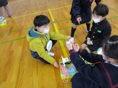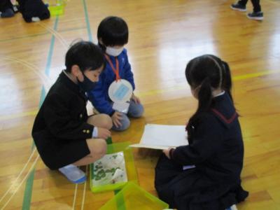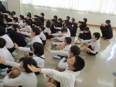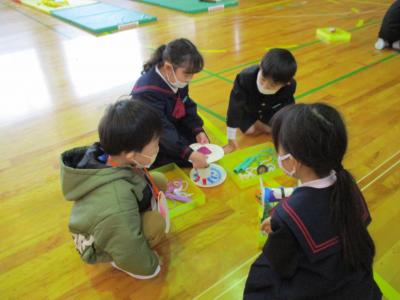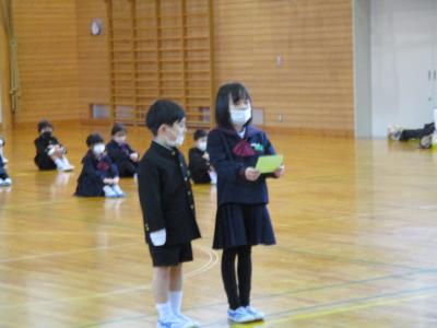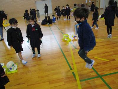1年生が年長さんを迎える会を行いました。最初に、小学校でどのようなことを勉強するか、代表の子が説明した後、実際に教科書の音読やカードを使っての計算などをやって見せました。続いてダンスを披露しました。音楽に合わせた、きれっきれのダンスを披露することができました。次に1年生と年長さんがグループになり、縄飛びやあやとりなどをして楽しく遊びました。最後に1年生が教室で授業をしている様子を年長さんに見てもらいました。全体の場で説明する姿や年長さんに優しく接する姿から、1年生の大きな成長を感じました。また、参加した年長さんも、話を聞く態度や、返事の仕方などもとても素晴らしかったです。4月に入学してくるのが楽しみです。