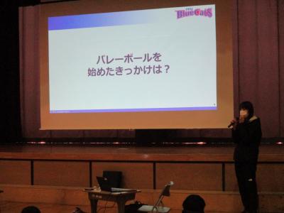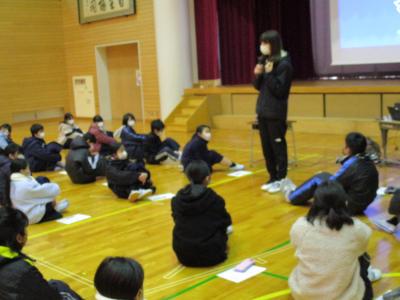 6年生が総合の時間にキャリア教育の一環として、PFUブルーキャッツの清水眞衣さんを講師にお招きしました。最初にバレーの実技体験を行いました。レシーブの体験では、手加減をされていましたが、それでも、スパイクの速さに子どもたちは驚いていました。その後、スライドを使いながら、バレー選手になった理由や、壁にぶつかったときにどのように乗り越えてきたか等、体験談を聞かせていただきました。バレーボールを通して「喜びを分かち合える仲間と出会えた」「続けることの大切さを知った」など、清水さんのお話は、6年生にとって、自分の将来を前向きに考えるよい機会となりました。