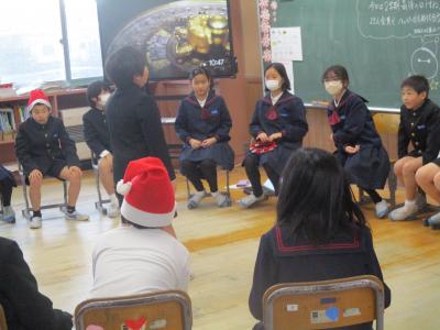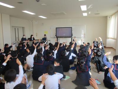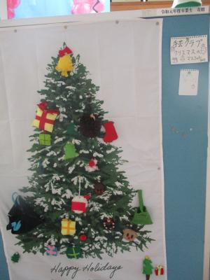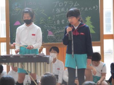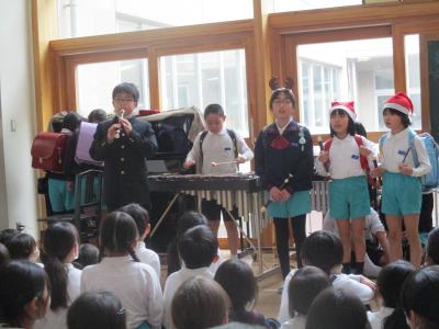 ミュージッククラブ主催のクリスマス音楽会が1階のフォールで行われました。クラブ活動の時間に練習してきた3曲「強風オールバック」「サブタイトル」「勇者」の3曲を披露しました。最後に今月の歌「ジングルベル」を会場に集まった全員で歌い、大いに盛り上がりました。また、会場には、手芸クラブが制作したクリスマスツリーの飾りも設置され、クリスマス気分を演出しました。