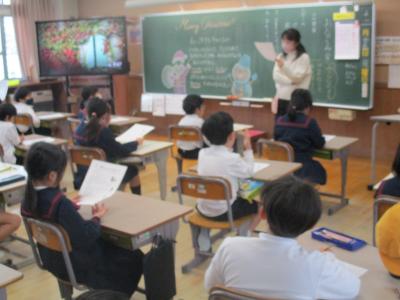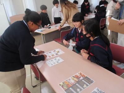 5年生が市内3中学校のALTの先生方を招いて英語の授業を行いました。今まで、子どもたちは「スペシャルゲストを高松小レストランでおもてなししよう」をめあてに、メニューを考えたり話し方を練習したりしてきました。今日はお客役と店員役に分かれて活動しました。店員役は英語でメニューの説明をしました。お客役は説明を聞いて注文したり値段を尋ねたりしました。3人のALTの先生方も交えて英会話を楽しむことができました。