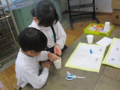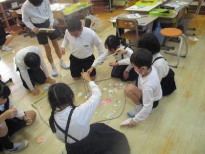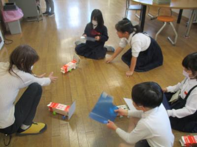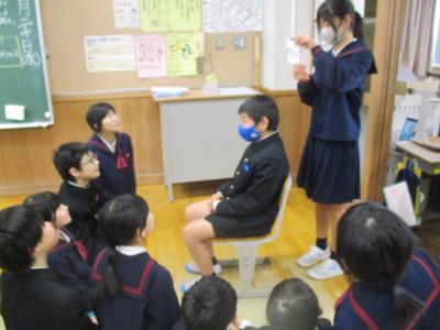 2年生が1年生をおもちゃランドに招待しました。2年生は今まで、国語の授業でおもちゃの作り方を説明する学習を行いました。その学習を生かして、自分たちが考えたおもちゃの作り方を、どのようにすれば相手に分かりやすく伝えることができるかを考えて説明書を書きました。その説明書を使って、1年生と一緒におもちゃを作りました。最後は完成したおもちゃを使って一緒に楽しく遊ぶことができました。