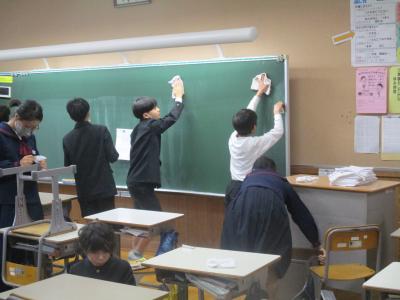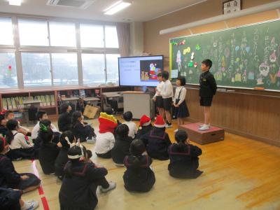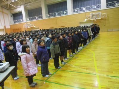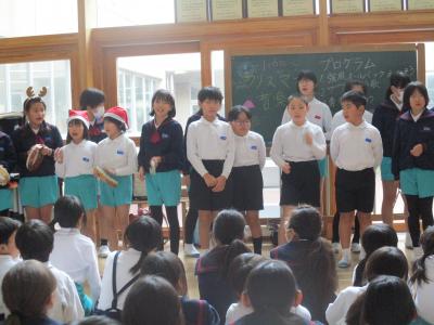 各クラスでは子どもたちで企画したお楽しみ会が行われていました。ゲームやクイズなど、それぞれで役割分担を行い、2学期最後の時間を楽しく過ごしました。また、自分たちが使った机、椅子、ロッカー、下駄箱などの掃除を行いました。どの児童も黙々と清掃活動を行い、2学期の汚れをきれいにすることができました。担任からは明日から始まる冬休みの生活や宿題について、お話がありました。子どもたちは真剣な表情で聴いていましたが、その意識が続くように、宿題は計画的に行い、規則正しい生活を送り、病気や事故に合わないことを願っています。