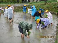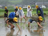 あいにくの天候でしたが、総合の学習で田植え体験を行いました。