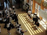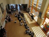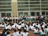 今日は5年3組の児童が,昼休みに音楽会に向けて練習している歌「愛の花」と合奏「怪獣の花唄」の発表を行いました。吹き抜けになっている校舎の中庭に100人以上の児童,先生が集まり,5年生の美しい歌声と合奏を楽しむ,すてきな昼休みとなりました。