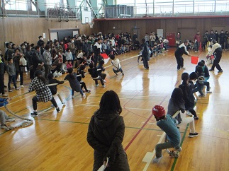 12月18日(日)に、大海小学校体育館でかほく市子ども会高松支部綱引き大会が開催されました。26チームが参加し、どのチームも元気いっぱいに力を合わせて大綱を引いていました。観戦しているチームも大きな声で応援し、大会を盛り上げていました。