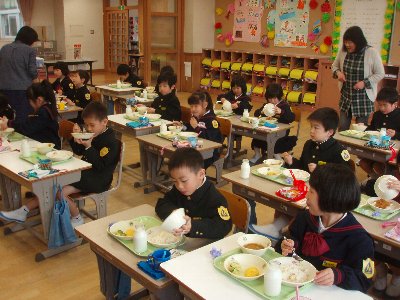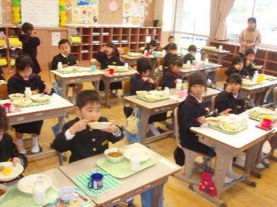 今日は初めての給食でした。メニューはカレーライスでした。上手に食べることができました。でも、びん牛乳のふたを開けるのに一苦労、だんだんうまくなるといいね。