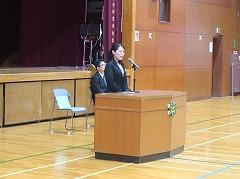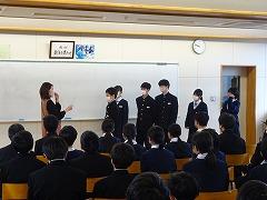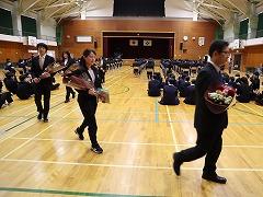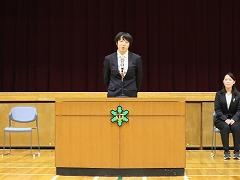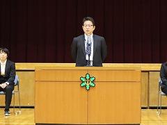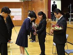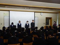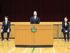 午後からは離任式が行われました。この度の異動で本校を転出する5名の職員から生徒へメッセージが送られました。また、生徒会執行部より 竹中 航生 さん(2の1)が、5名へのこれまでの思い出と合わせて、感謝の言葉を贈りました。転出される方々の、今後のご活躍を祈っています。