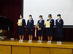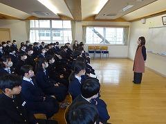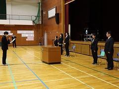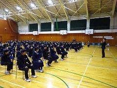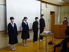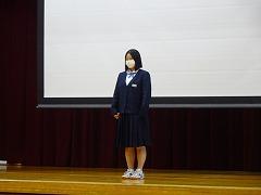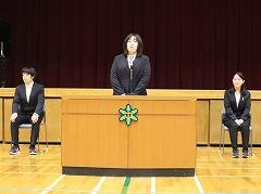4限は修了式です。修了式に先立ち、3日に行われた第20回かほく市政試行記念継走大会で優勝した陸上部の表彰披露と3月28日から岐阜県で開催される第20回都道府県対抗中学生ソフトボール大会に石川県選抜の一員に選ばれた 上野 杏樹里さん(2の1)の激励会が行われました。上野さんは、4番バッターを任されているとのことでした。