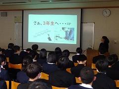 修了式では、1年間のまとめとして校長先生から「一歩、進歩、そして躍進へ」が示されました。1年生は中学生として一歩を踏み出し、今年の経験を生かして進歩してほしい、2年生は既に生徒会活動や部活動で中心を担っていますが、いよいよ4月からは高松中学校の「顔」として自分自身、学校を躍進させてほしいと話がありました。