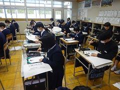 昨日、2年生は合同帰HRの中で学習の集会をもちました。集会の内容は「高校進学に向けた学習の進め方」です。来年1月より高校進学に向けた学習が始まります。週2回の朝読書も朝学習に変わります。学習担当の先生より4月下旬頃まで使用する1、2年生の復習教材、冬休みの課題となる教材の紹介と、その進め方について話がありました。この日、3年生は第3回の統一テストを受けていたということもありm「いよいよ自分の番が来た」という思いで緊張感を持って学習の取組について話を聞いていました。