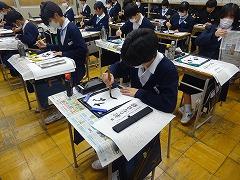 冬休みの宿題に書き初めがあります。1年生「不言実行」、2年生「新たな目標」、3年生「旅立ちの春」を家庭で書き、自分の一番の作品を提出します。写真は2年3組での授業のようすです。正しい姿勢、正しい筆の持ち方に気をつけて、息を止めて書いていました。みんなの集中からくる静寂さが素敵でした。