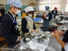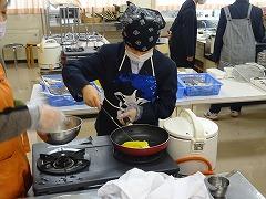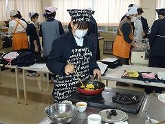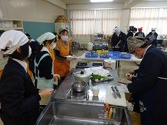 写真は1年3組の家庭科の授業での調理実習のようすです。献立名は「小松菜の変わり浸し」と「卵料理」です。「小松菜の変わり浸し」は小松菜をゆで、調味たれと和え、チーズ、わかめ、しらすを混ぜ盛り付けました。「卵料理」は「卵巻き」「目玉焼き」「スクランブルエッグ」の中から、生徒が1つ選んで調理しました。前回までの授業で計画を立て、今日の実習に臨みました。これからの冬休み、お家でも作ってみる機会があるといいですね。1、2組の調理実習は16日(火)に行われました。