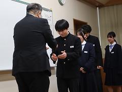 かほく市役所上下水道課より、猪村 邦顕 課長ら3名が来校され、本校3年生にマンホールカードが贈られました。マンホールのふたは丸いことから「落ちない」、凹凸があることから「すべらない」、さらに答案に 〇 が並ぶようにと、合格祈願として贈られました。各クラスの代表2名がカードを受け取り。「入試まで残された日の学習を頑張る」と入試に向けての決意とお礼の言葉を述べました。このカードの贈呈は 2016 年から続いているとのことでした。本当に入学試験の日程が近づいてきたと感じるとともに、地域の方々にも応援されていることを知れた贈呈式になりました。