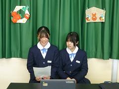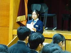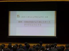 さらに、1、2年生プログラム委員会から合同で「令和8年度高中SDP」について説明と取組について話がありました。「SDP」とは、スタート ダッシュ プログラム の頭文字をとり、令和8年度により良いスタートが切れるようにすることを目的にしています。「SDP」の3学期の目標は「 徹底 ~行動に責任、楽しいに花~ 」と示され、本校伝統三項目の一つ「挨拶」に取り組みます。